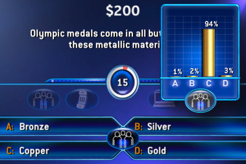Millionaire 2010![]() Краткий обзор игрыMillionaire 2010 - мобильная адаптация популярной телевикторины под названием "Кто хочет стать миллионером". Теперь проверить свои знания и заработать первый миллион, вы можете прямо не вставая со стула. Для этого вам придется ответить на несколько вопросов, которые затрагивают практически любые темы, от театра и кино до географии, истории, биологии, химии и даже термодинамики. Готовы? Тогда приступаем!Как и в оригинальной передаче, вас ждет более десятка вопросов (разной степени сложности), три подсказки, три несгораемые суммы, а также обещанный миллион, который будет оставаться в ящике, вплоть до самого финала. Для тех, кто незнаком с первоисточником, напомним - если вопрос оказался слишком сложным, то вы всегда можете использовать вспомогательные инструменты: 50 на 50 (автоматически убирает два неправильных варианта ответа), звонок другу (поможет вам определиться с выбором нужного варианта) помощь зала (аналог "звонка другу", то теперь вам будут помогать всей студией), либо, если вы совсем не уверены в себе, то просто заберите заработанную сумму при достижении очередной "несгораемой точки". Несмотря на достаточно простенькую графику и совершенно символический размер самой игры, "Millionaire 2010" полностью дублирует стиль оригинального шоу, а также может похвастаться внушительным списком самых разнообразных вопросов. Другими словами, почитатели добротных интеллектуальных игр - останутся довольны! Голосов: 0
